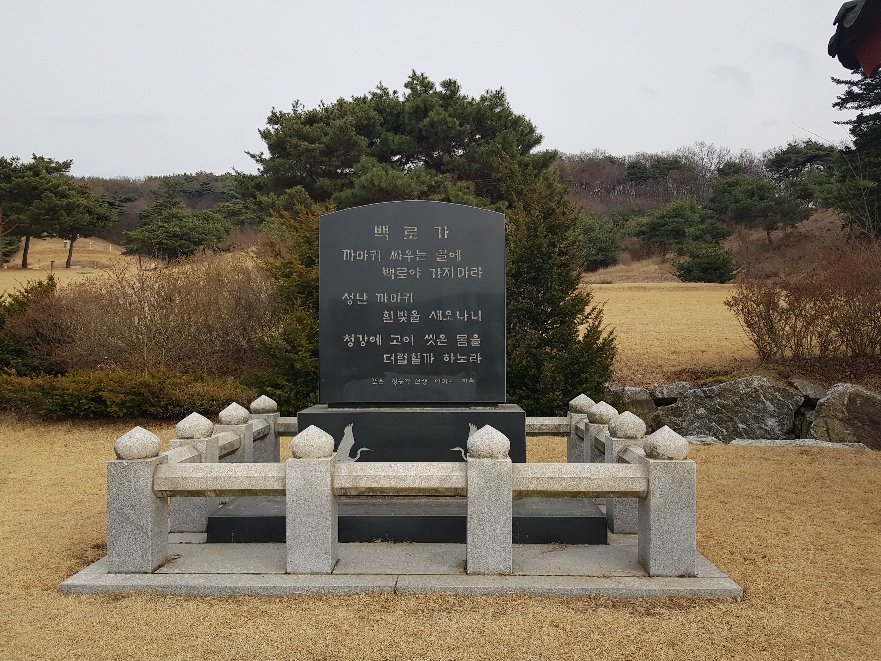Jeong Mong - ju 's mother foresaw that her son would become a great person in the future because he was intelligent from young age and left the poem to Jeong. It is engraved on the stone. It is written in a language that was used in ancient times, so I write down it as the modern language. 'White heron, do not go to the valley where the ravens fight. I am afraid that the crows will be jealous of your pure white light. I am worried that the body that is washed clean in clear water may become dirty.’