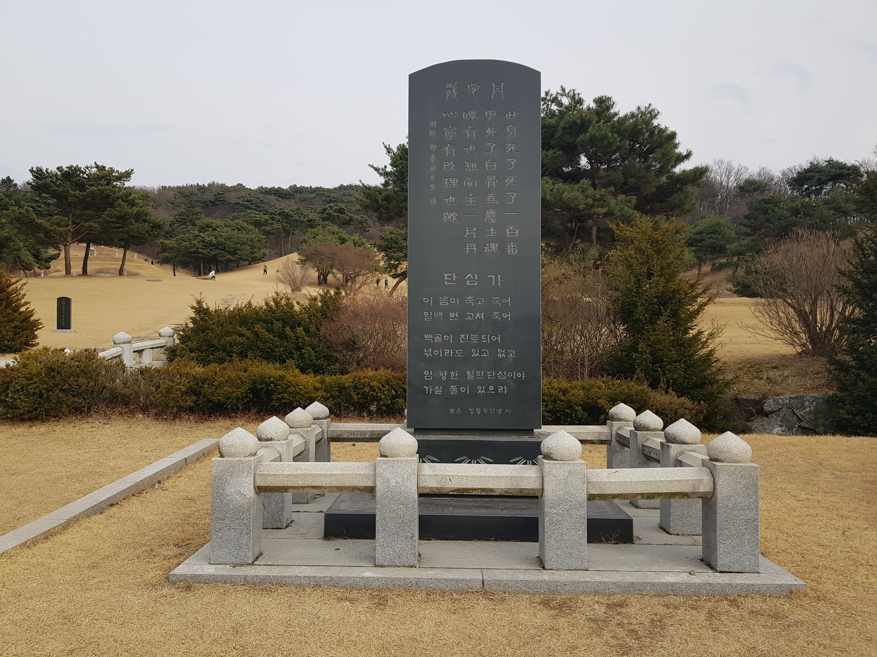He asked to write the official name of the Goryeo dynasty on his gravestone during his will. Currently, the official name of his Goryeo dynasty is written on the front of the tombstone. Even though Lee Bangwon who killed him as political opponent, though he had a political purpose, lifted the Jeong Mongju to the symbol of loyalty. For this reason, although Jeong was the loyalist of Goryeo dynasty who kept fidelity with his life, but he was worshipped as the father of Neo Confucianism and eternal loyalist during the Joseon Dynasty.