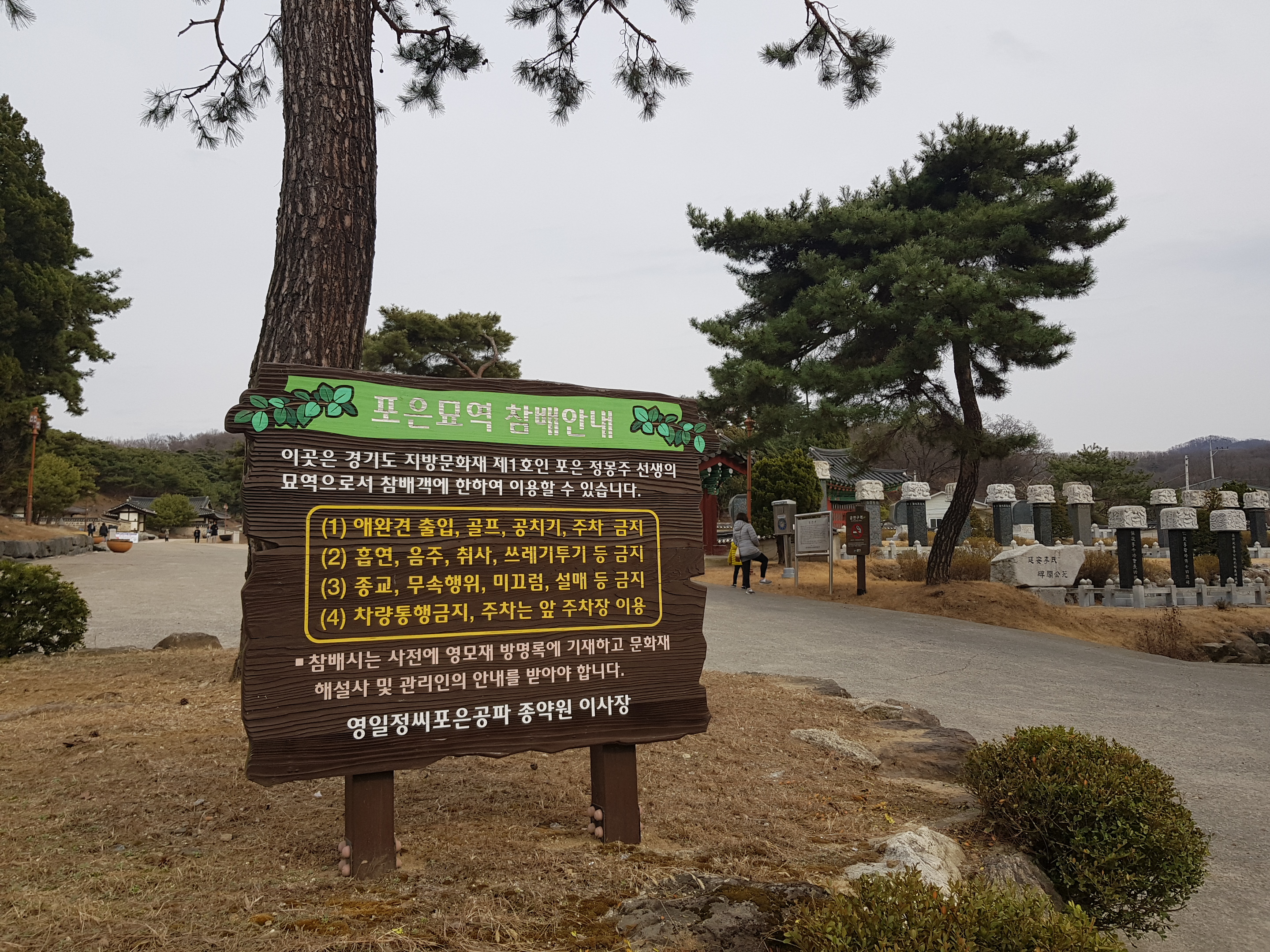 묘역에 참배시 유의사항이 적혀있다. 골프, 미끄럼, 썰매를 타지 말라는 내용이 재미있다. 잔디가 워낙 잘 조성되어 있고 언덕이 썰매나 미끄럼 타기에 좋게 되어 있어서 간혹 이런 행위를 하는 이들이 발견되나 보다. 정몽주 선생의 기운을 받고자 종교, 무속행위를 하는 사람들도 있는지 이것도 금지사항에 포함시켰다.