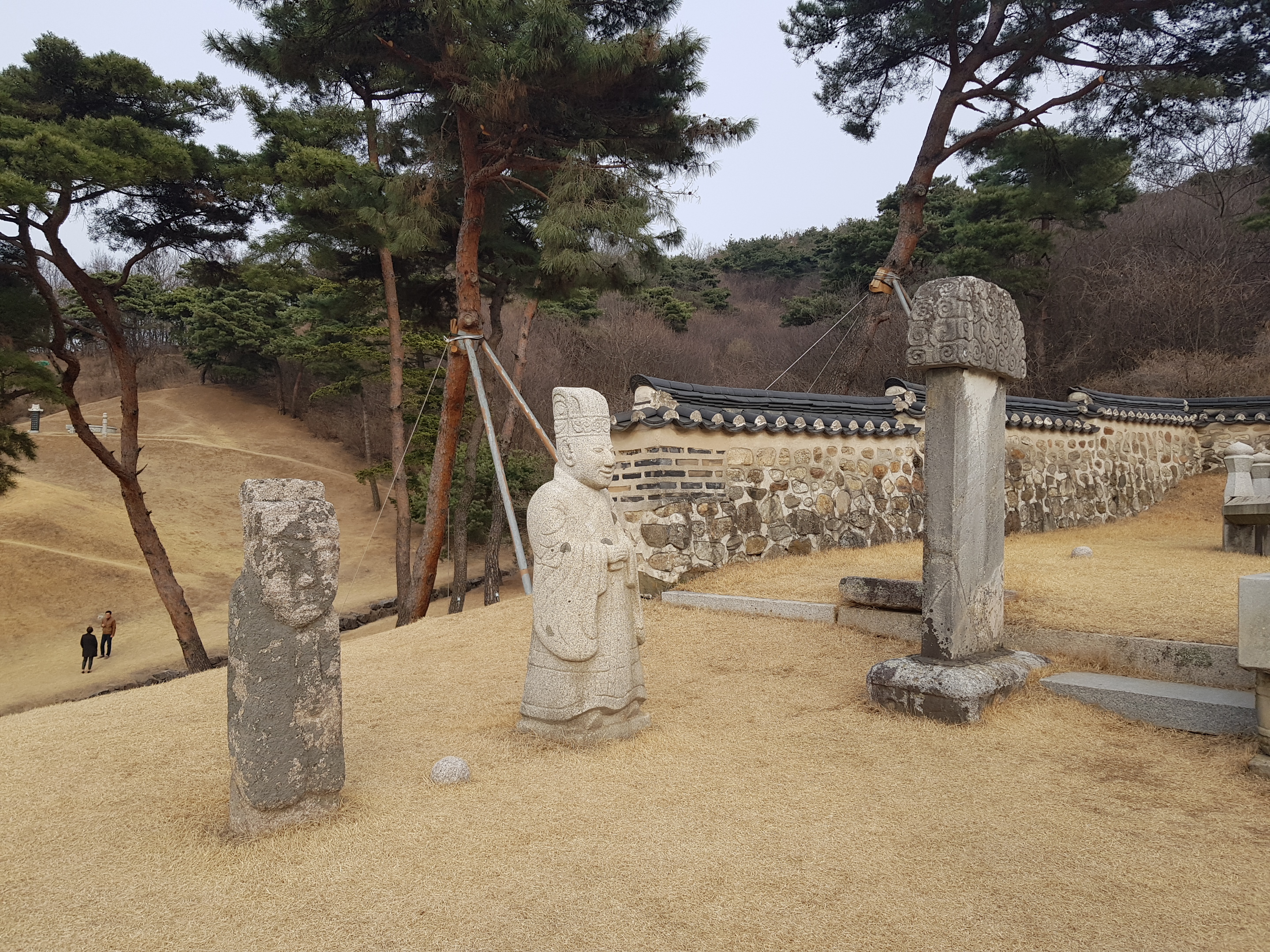 옛날 문인석과 최근에 세워진 것으로 보이는 것이 나란히 서서 대조를 이룬다.