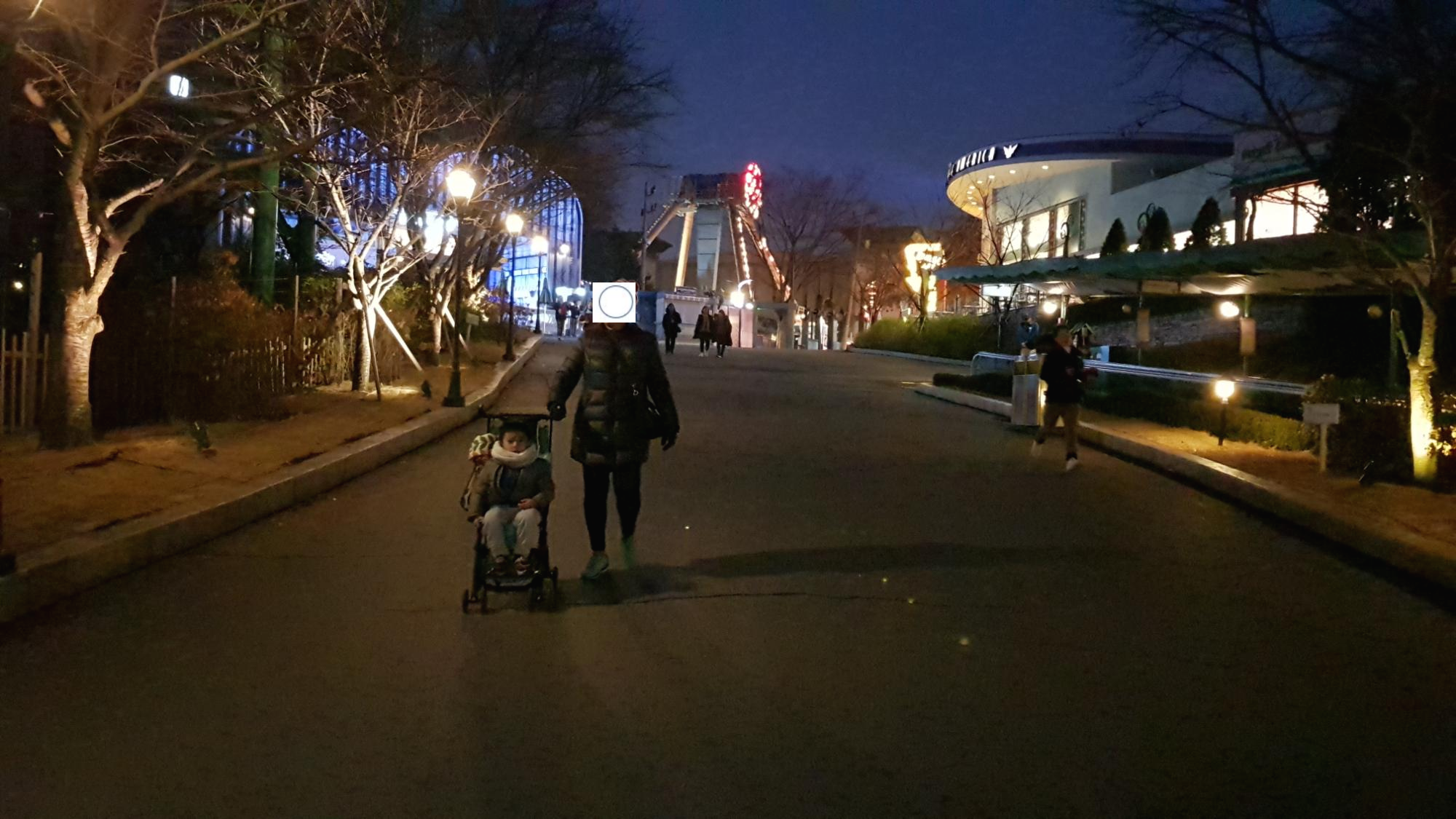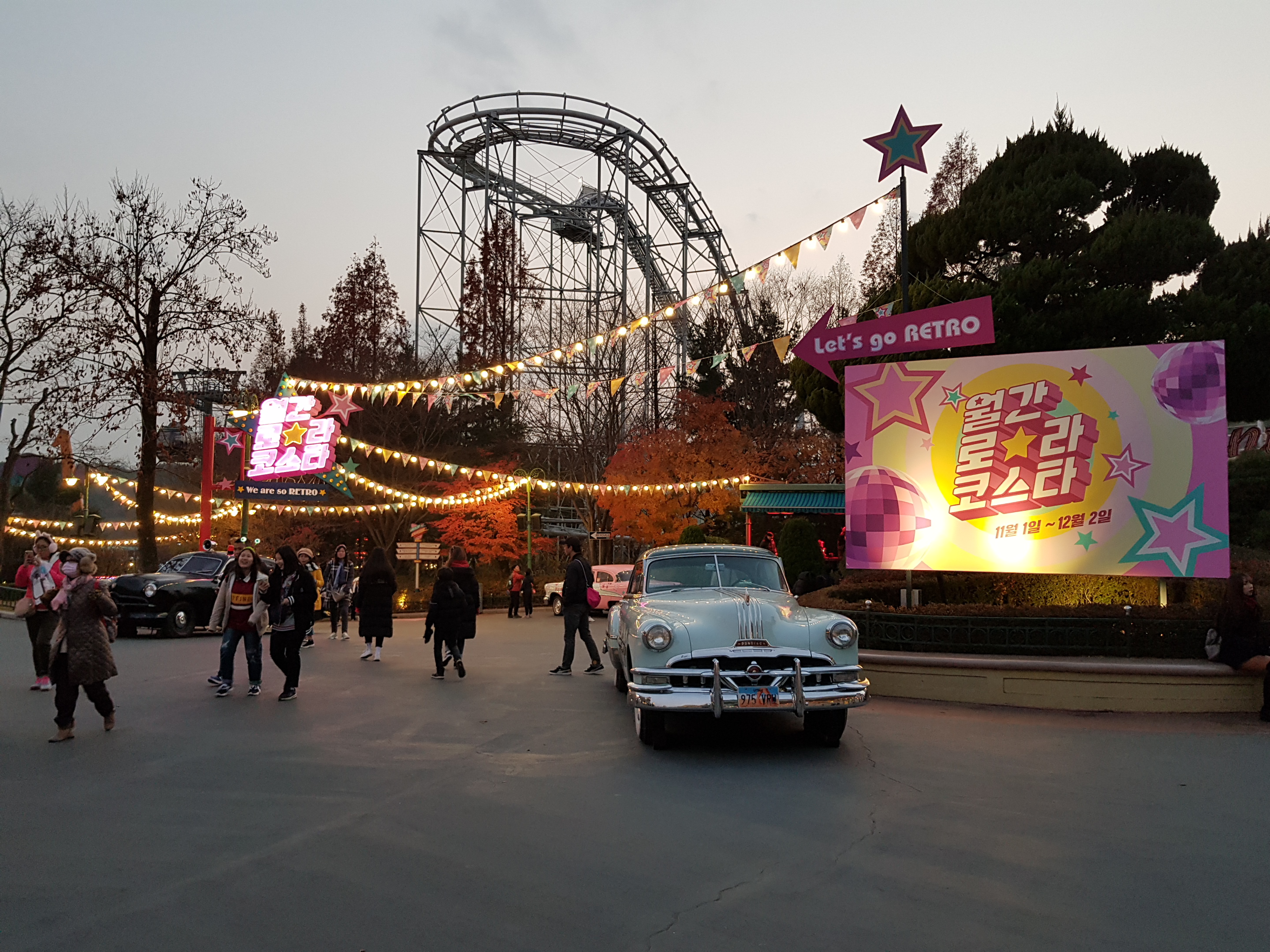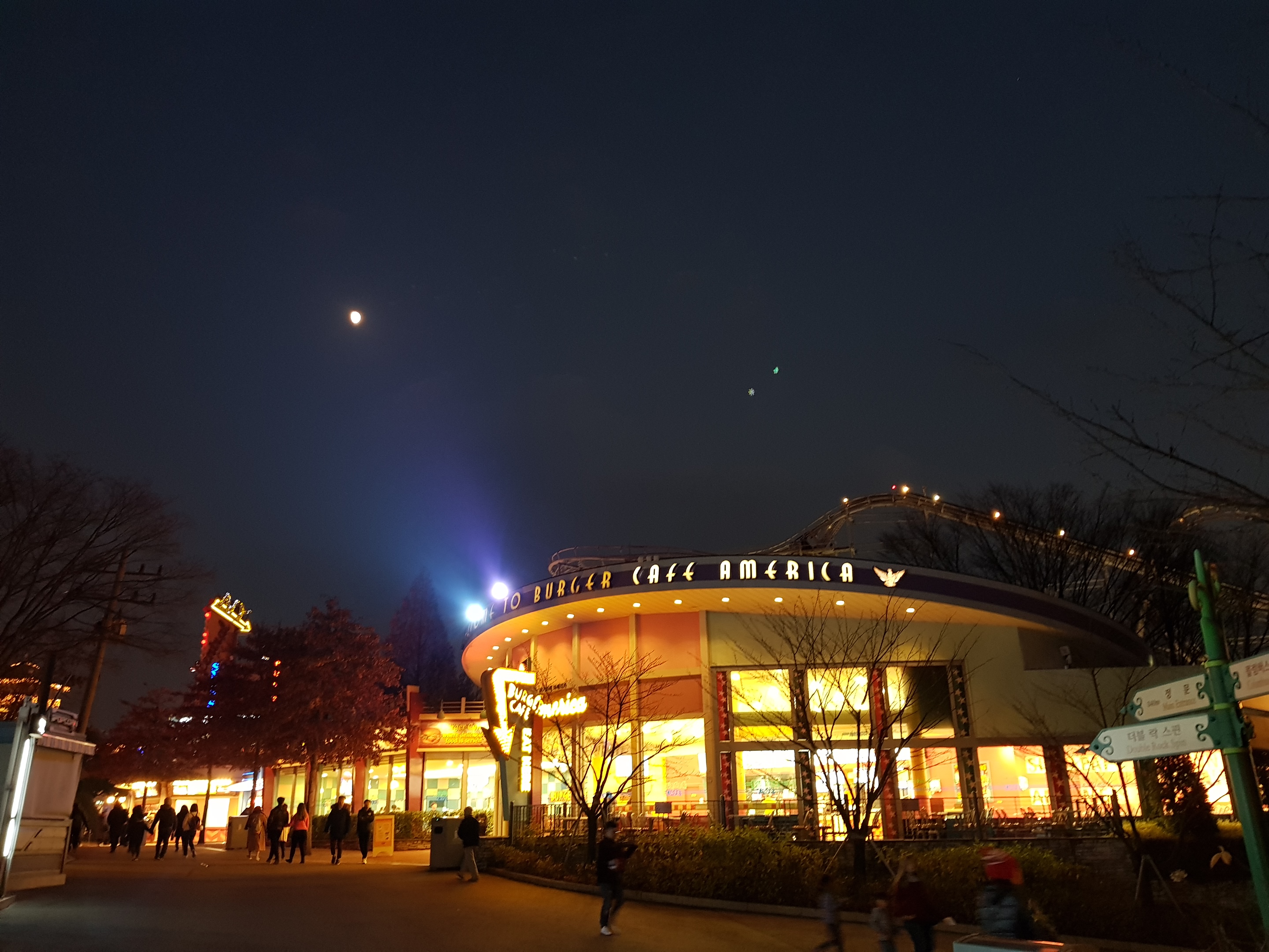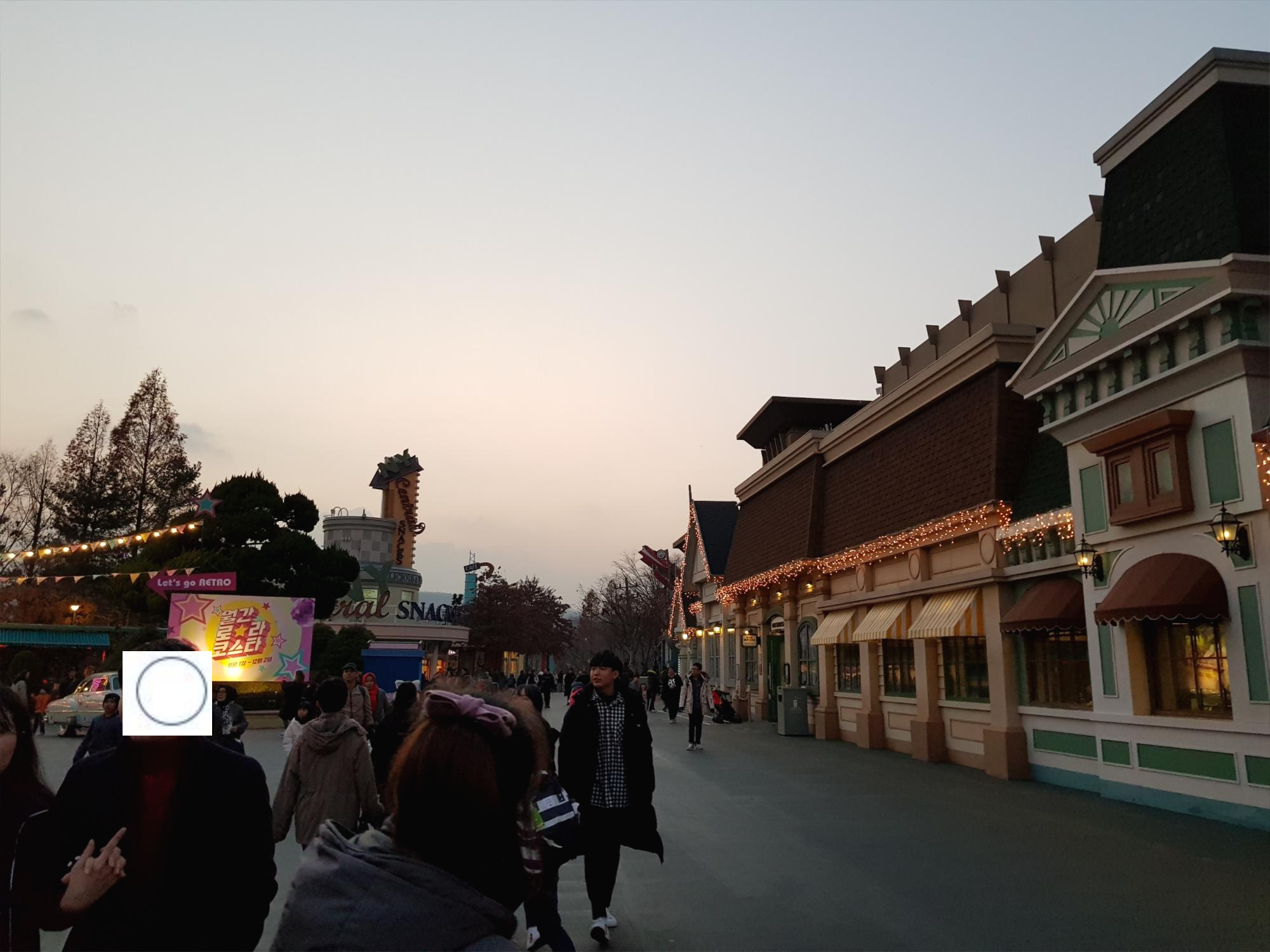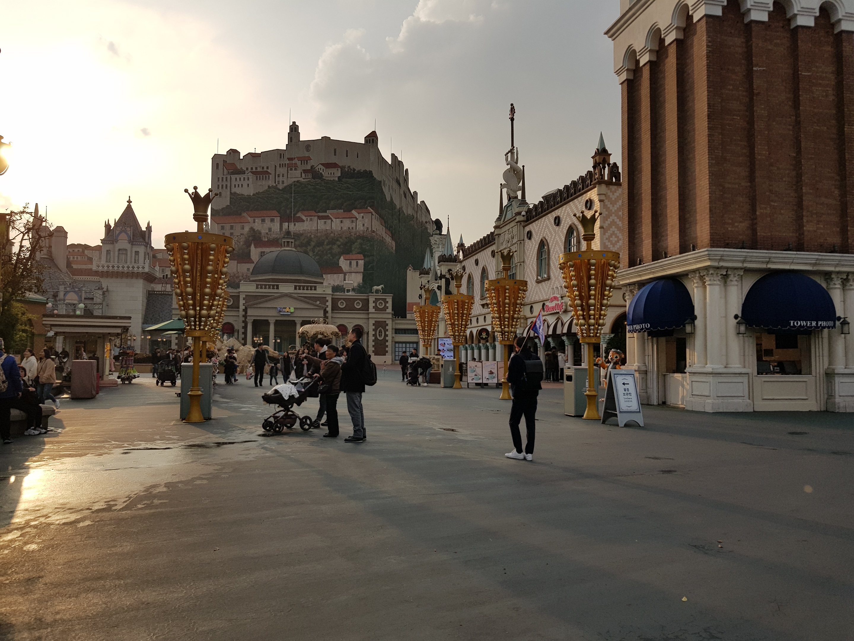 점점 해가 지고 있다. 앞에 아메리칸 어드벤쳐가 보인다. 1950~60년대의 미국을 테마로 조성된 공간이며 각종 놀이기구들이 모여 있는 곳이다. 청소년들에게 가장 인기있는 장소라고 보시면 된다.