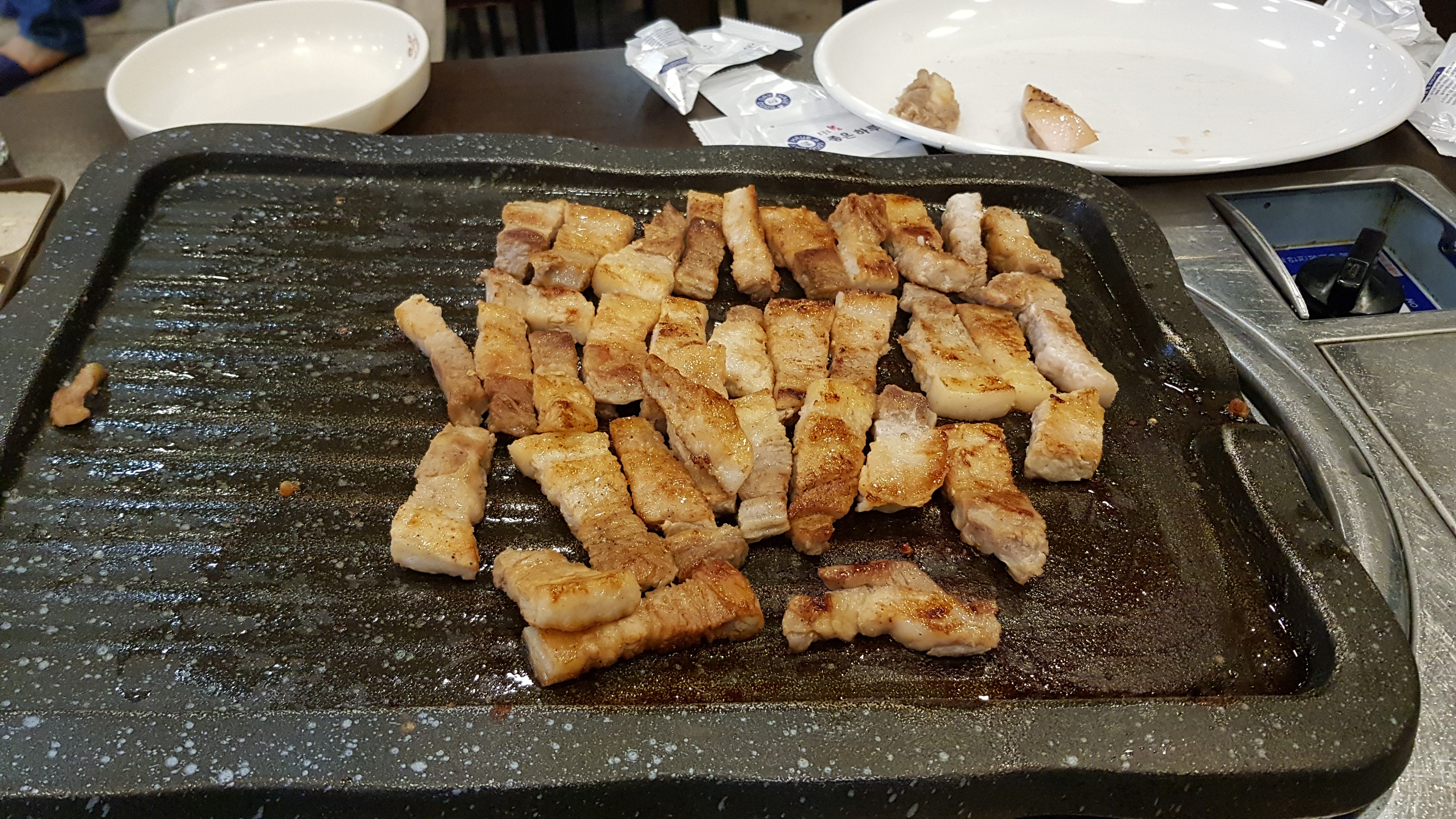 매운 음식을 못 먹는 아이를 위해 삼겹살을 주문했다. 삼겹살 전문점이 아니라 고기의 맛은 평균 정도라고 보시면 되겠다. 아무래도 감자탕이 소주와 잘 어울리는 음식이다 보니 손님들 중에 삼겹살을 찾는 분들이 많았고 그들의 요구에 맞춰 마련된 메뉴가 아닌가 싶다.