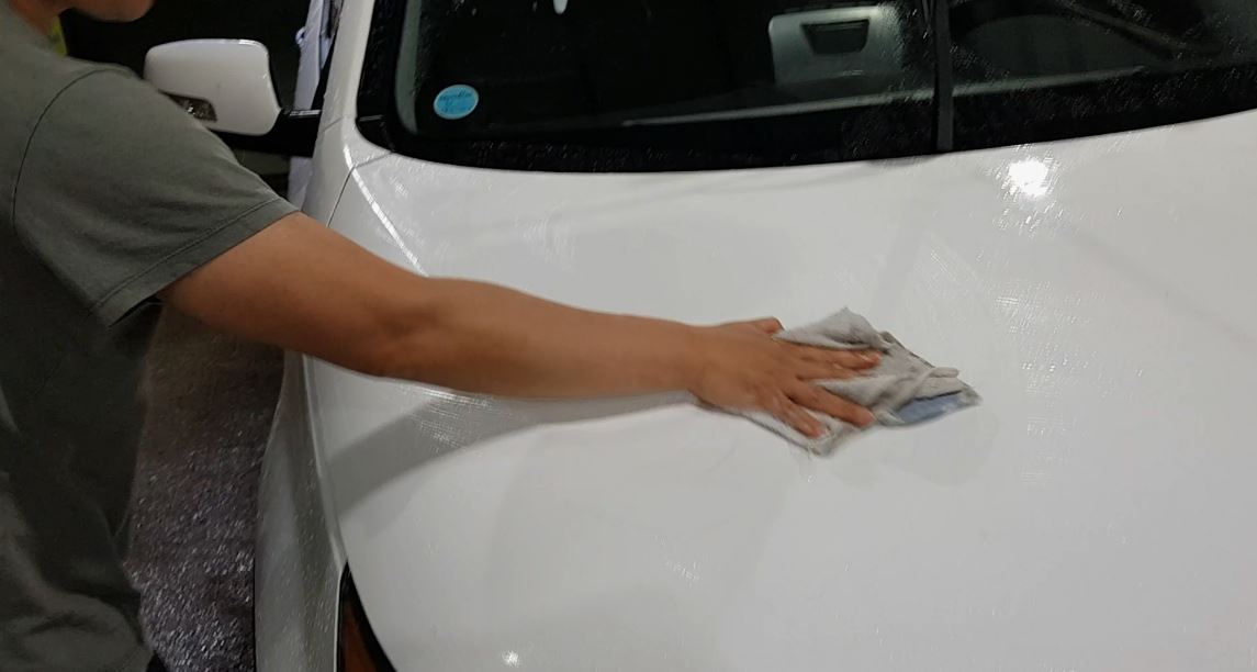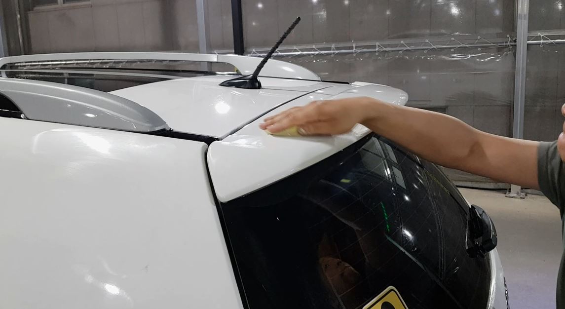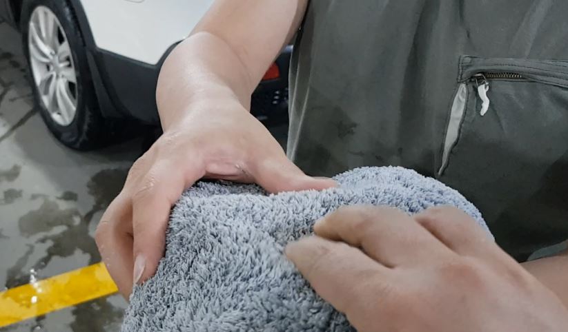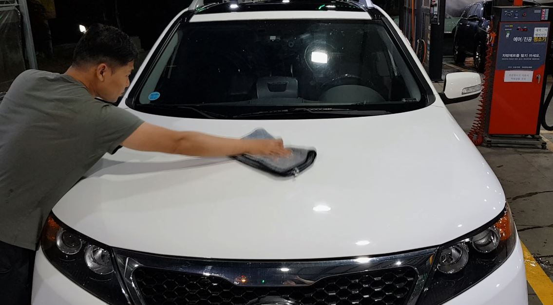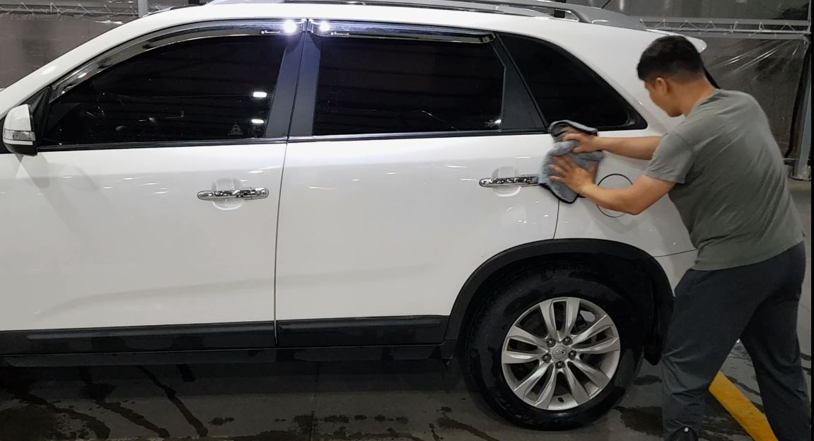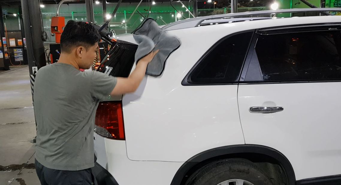 고체 왁스 작업이 끝났으면 남아있는 물기를 간단히 제거해 줍니다. 왁스 작업하기 전보다 물기의 양이 확실히 줄어 있어서 차량 표면은 사실 별도로 닦아주실 필요는 없을 것 같고 트렁크나 앞 뒷문 틈새에 고여 있는 물기 위주로 닦아주세요~
