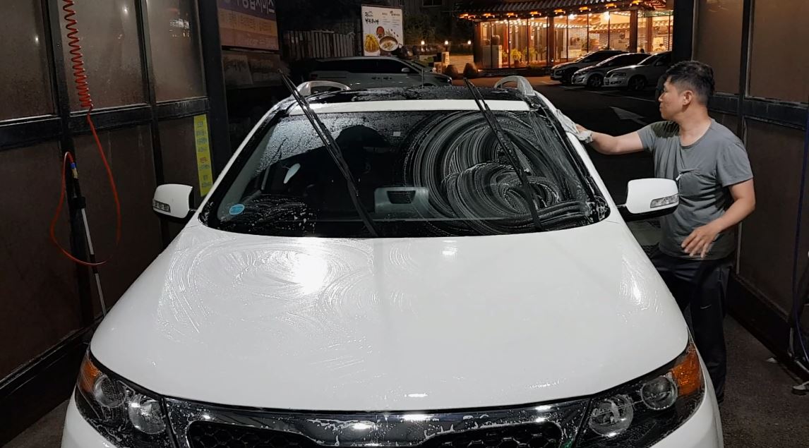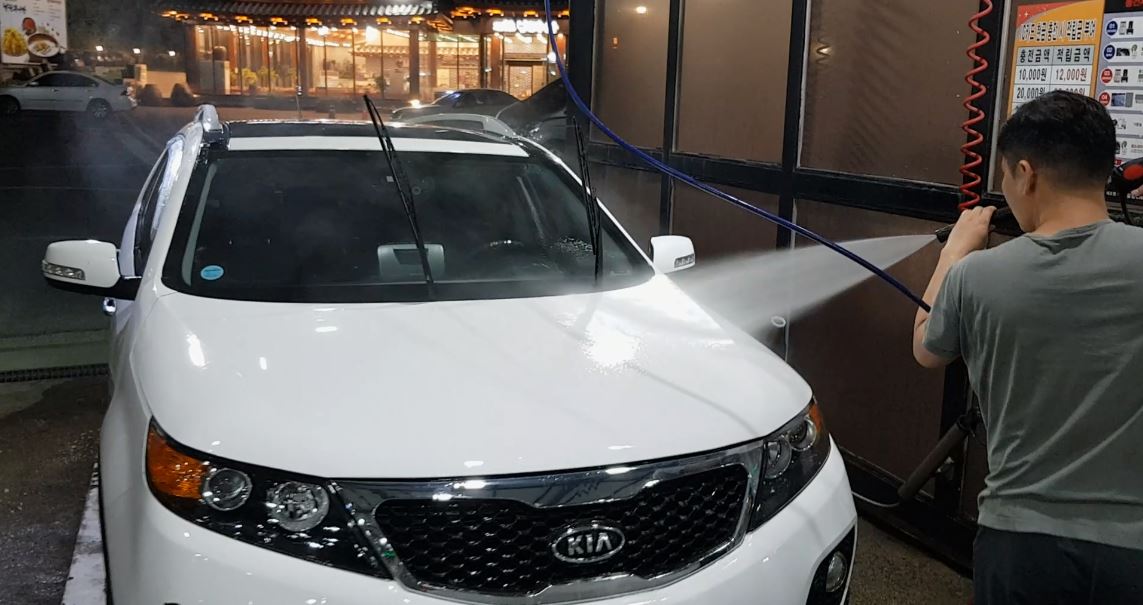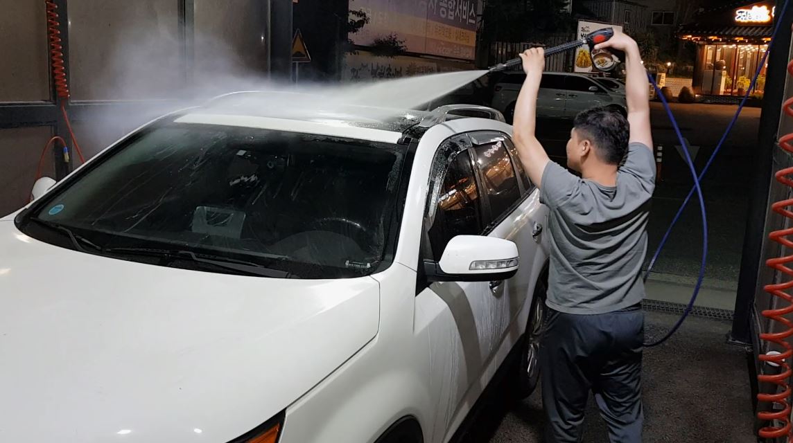 자 이제 셀프세차장에 비치된 고압수 세차기를 이용해서 차에 골고루 물을 뿌려줍니다. 겨울편에서 말씀드렸듯이 ‘위에서 아래로’ 물 뿌려주시는 것 잊지 마세요! 오염물질이 물을 타고 위에서 아래로 흐르기 때문에 효율적 세차를 위한 필수 방법 이랍니다. ㅎㅎ