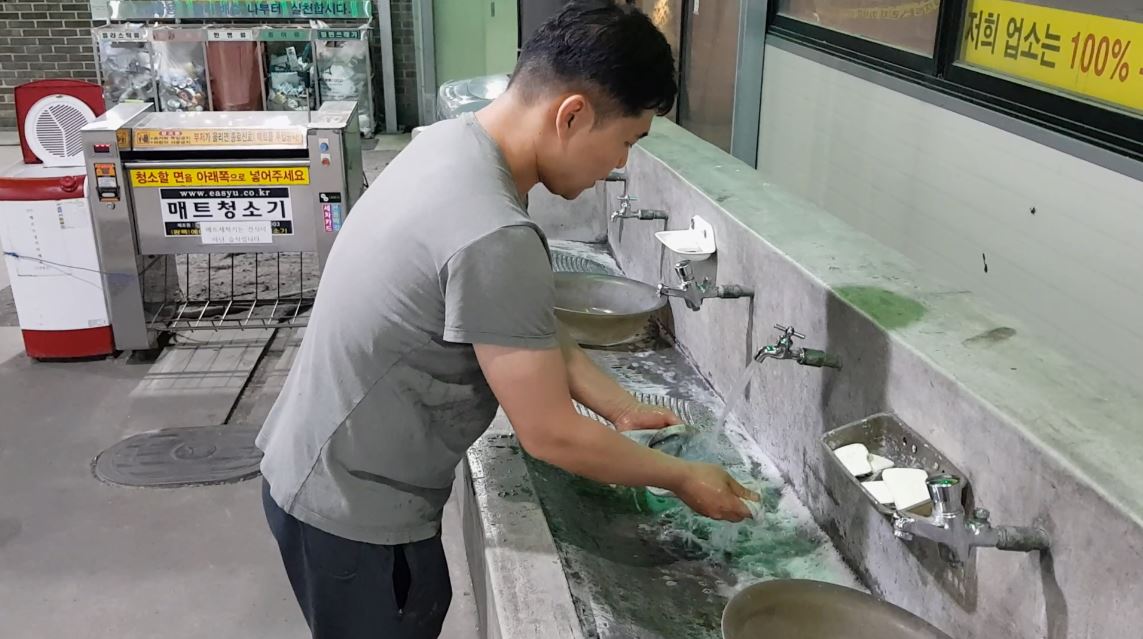 예비 세척에 앞서 세차장에 비치되어 있는 수돗가에서 워시 미트(샴푸 시 사용하는 천)에 물을 적셔 줍니다. 이때 방금 사용하신 휠 브러시도 다음 사용을 위해 세척해 주시는 센스!
