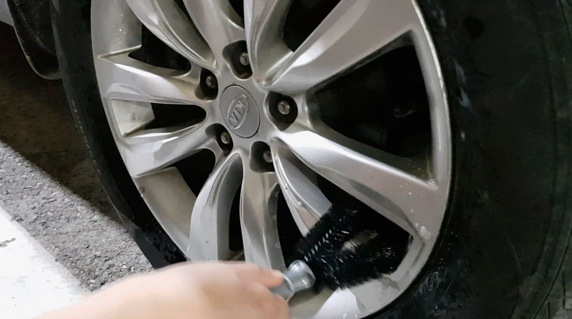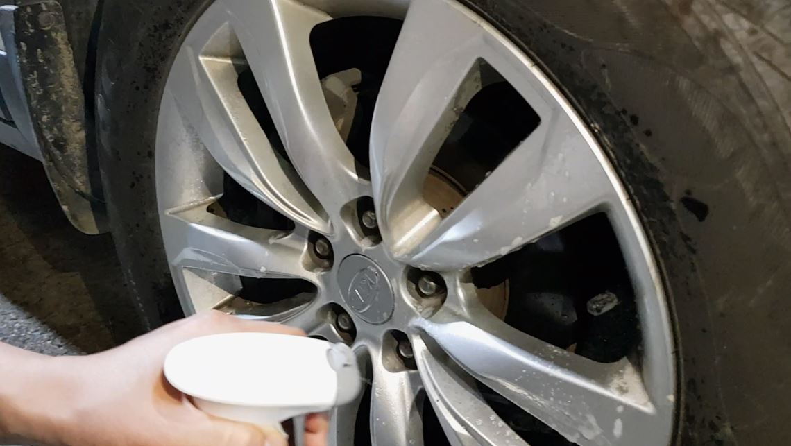 전용 휠 세정제를 휠에 뿌려주고 30초 정도 기다려 줍니다. 그러면 휠에 뿌린 세정제가 보라색으로 바뀔 거예요.분진의 쇳가루가 반응하여 일어나는 현상이라고 보시면 됩니다. 이렇게 됐을 때 휠 브러시로 살살 문질러 주세요.