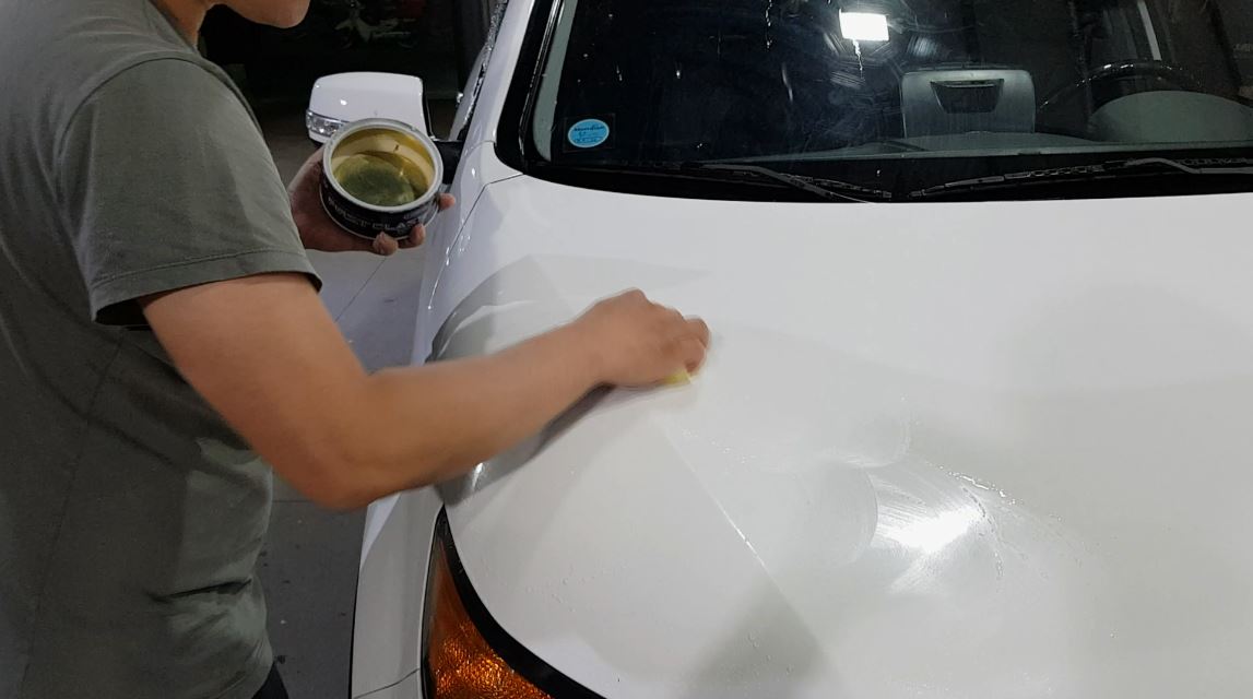 물기가 있는 상태에서 고체 왁스를 어플리케이터라고 부르는 스펀지 등에 듬뿍 찍어서 차 표면에 원을 그리면서 문질러 줍니다. 물기가 있는 상태에서 작업을 하기 때문에 연고 바르는 것처럼 슥슥 잘 발리는 것을 느끼실 수 있을 거예요.