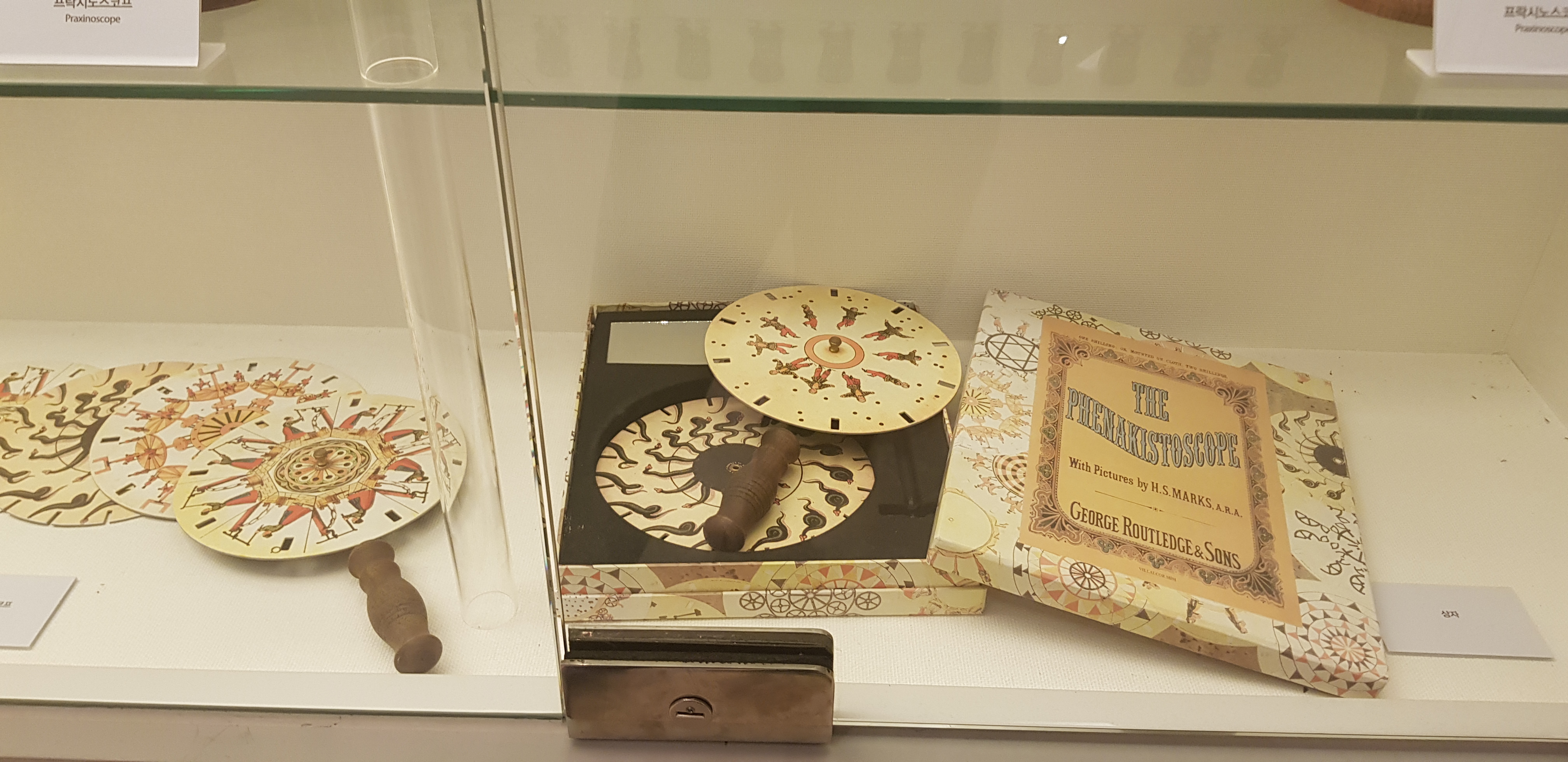 영화 장치가 개발되기 전 애니메이션 장난감으로 활용된 조에트로프이다. 움직이는 다양한 모습을 그린 뒤 원기둥에 붙여서 회전시키면 착시현상을 통해 그림이 움직이는 것 처럼 보인다. 지금보면 시시해 보일 수도 있겠지만 당시에는 획기적인 발명품이었으며 귀족들의 모임에서 즐겨 상영되곤 했다.