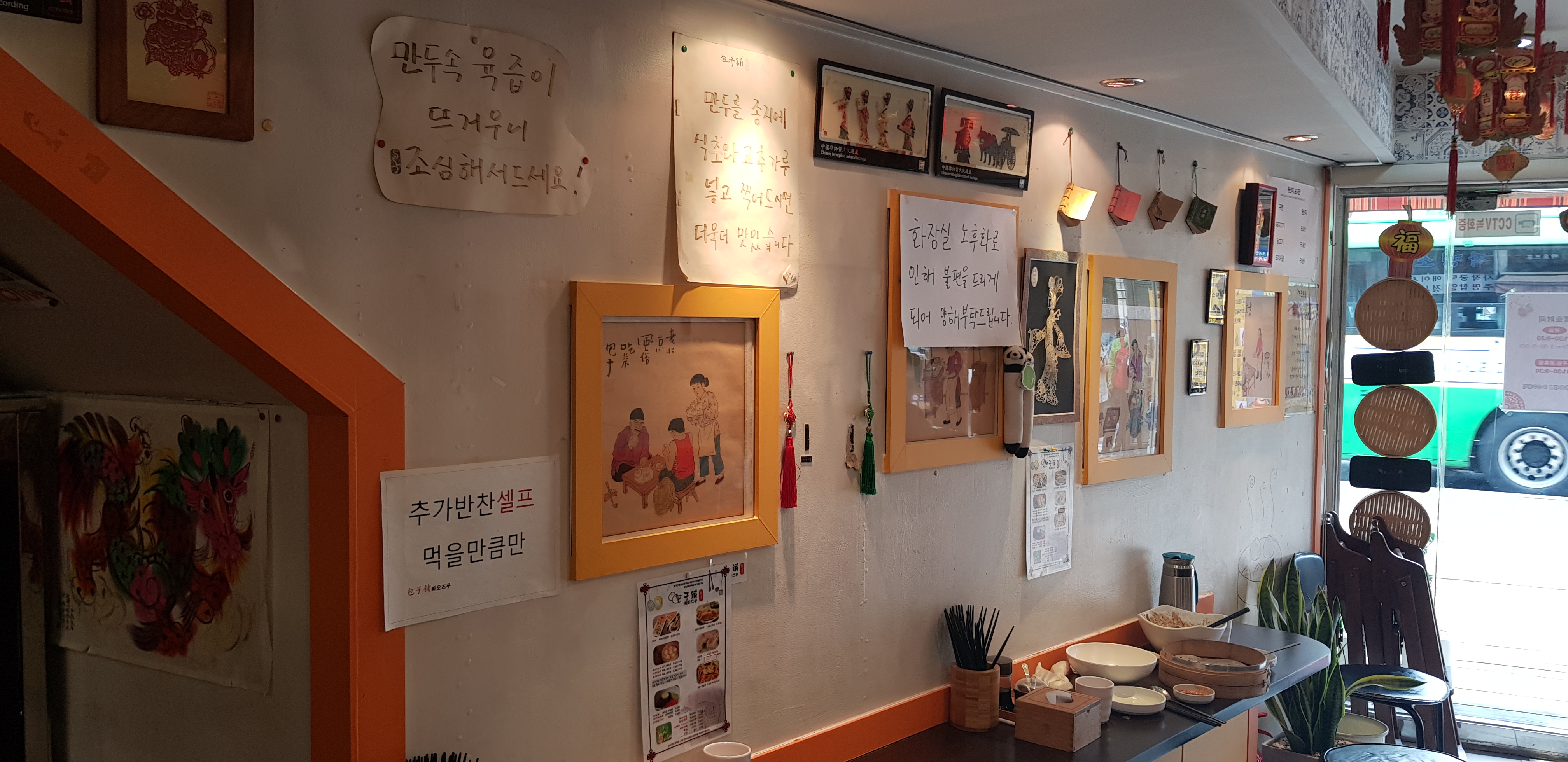 음식점 한 쪽 벽면에는 여러 장식품들과 함께 우리나라의 분식점에서 볼 수 있는 문구들이 적혀있다. 이 집 주인장부터 종업원까지 모두 중국인이라는데 한국에서 영업을 하시면서 현지화가 다 된 것 같아 웃음이 나왔다.