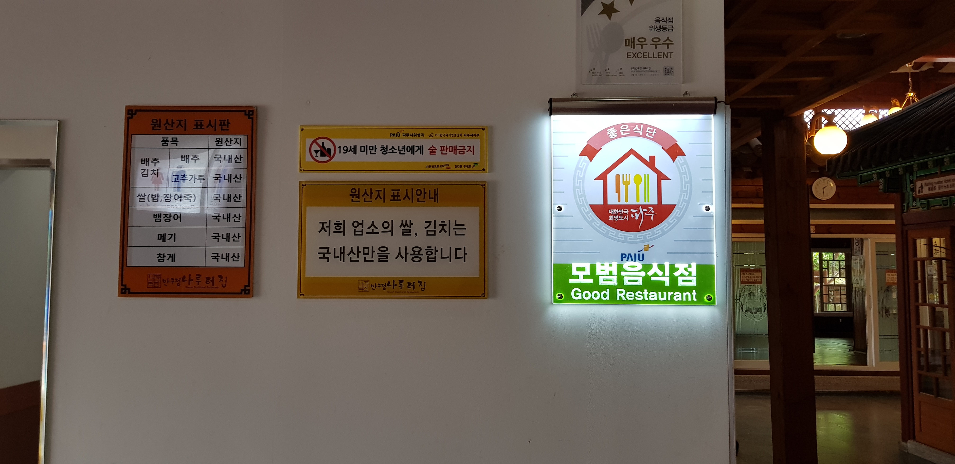 유명 음식점 답게 모범음식점 타이틀도 달고 있고 원산지 표지 규정도 잘지키고 있으며 위생검사에서도 우수한 등급을 받았다고 한다.
