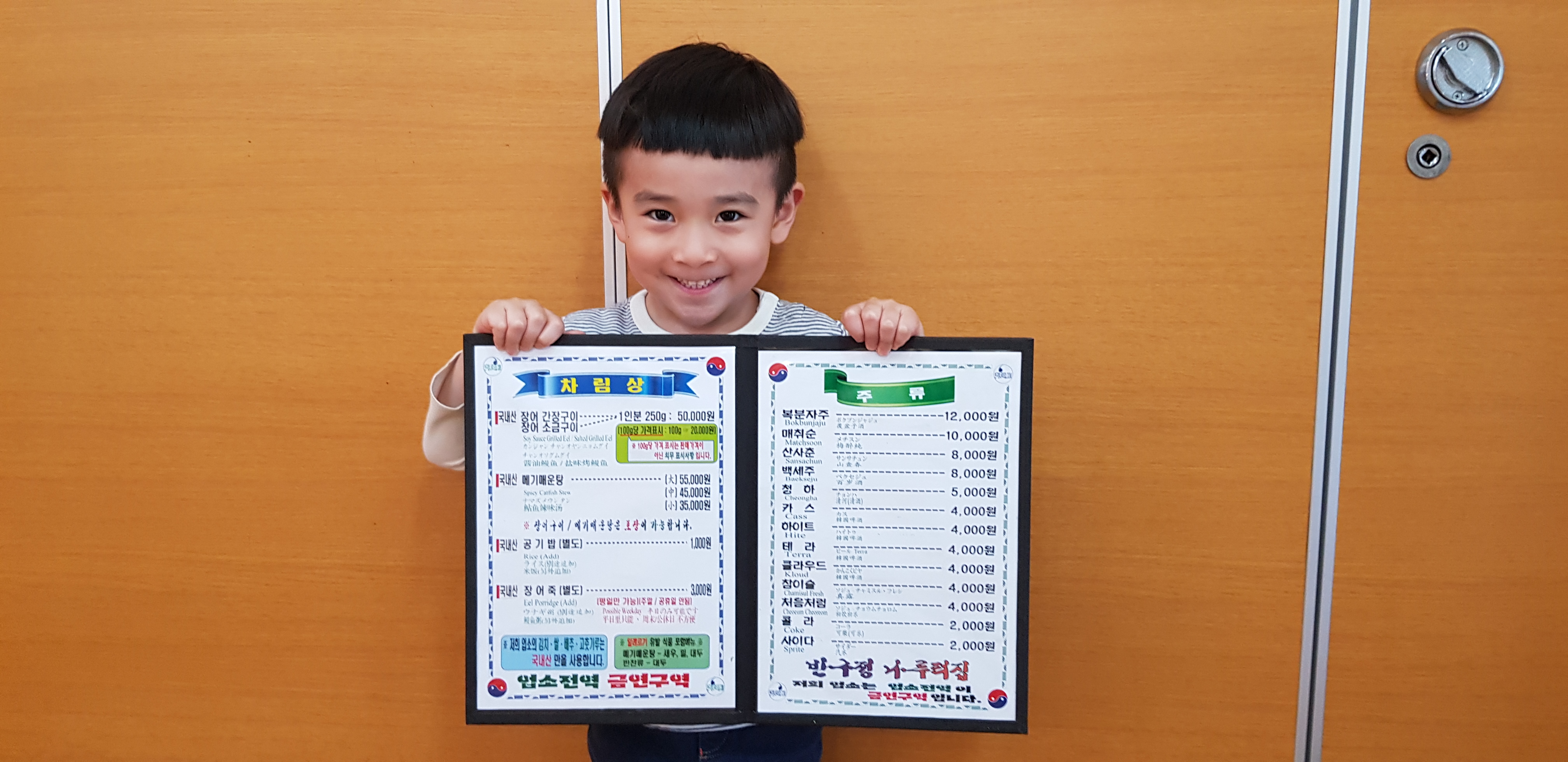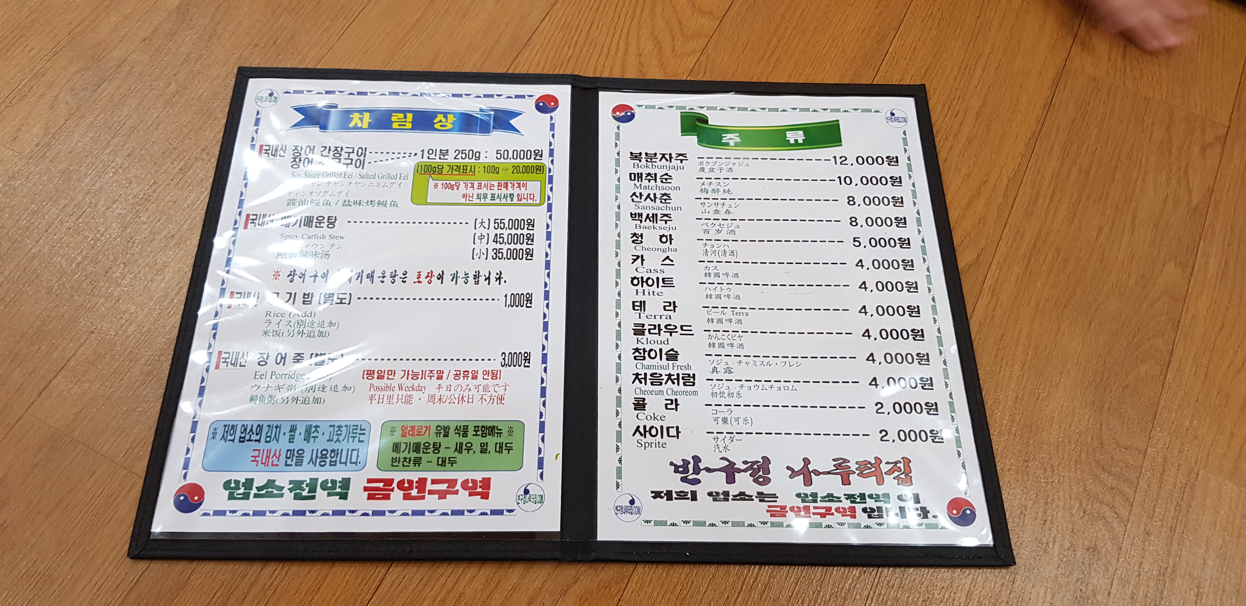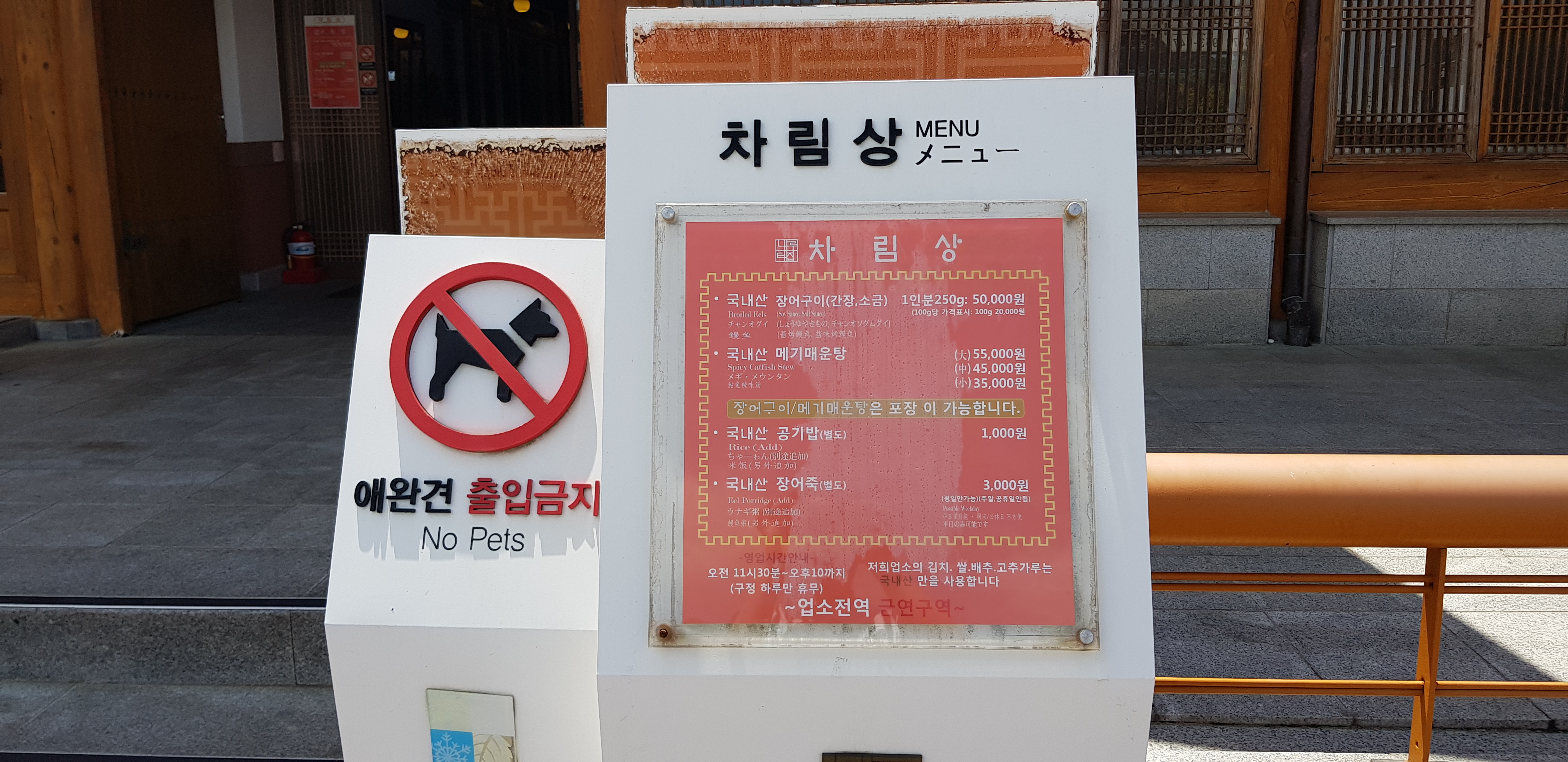 음식점 입구에 메뉴판이 마련되어 있는데...... 가격이 만만치 않다. 장어 250g에 50,000원인데 일반 음식점에 비해 2배정도 비싼 가격이라고 보시면 되겠다.