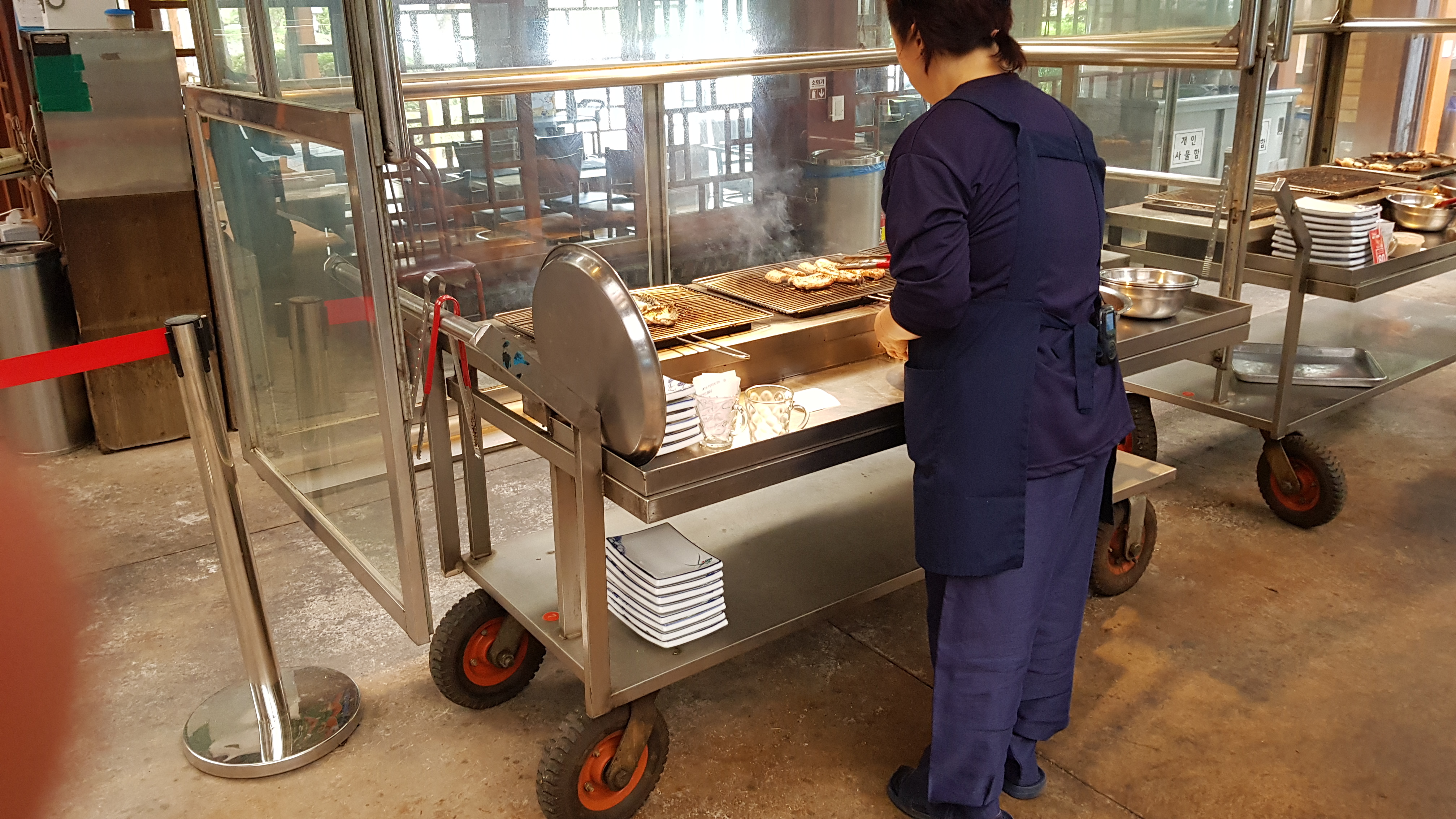 홀을 지나 안으로 좀 더 들어가면 마당이 나오는데 종업원들이 장어를 굽고 있었다. 보통 장어 음식점들은 손님이 테이블에 마련된 불판에서 장어를 직접 구워먹는데 이곳은 특이하게도 미리 장어를 구워서 손님상에 내 놓는다.