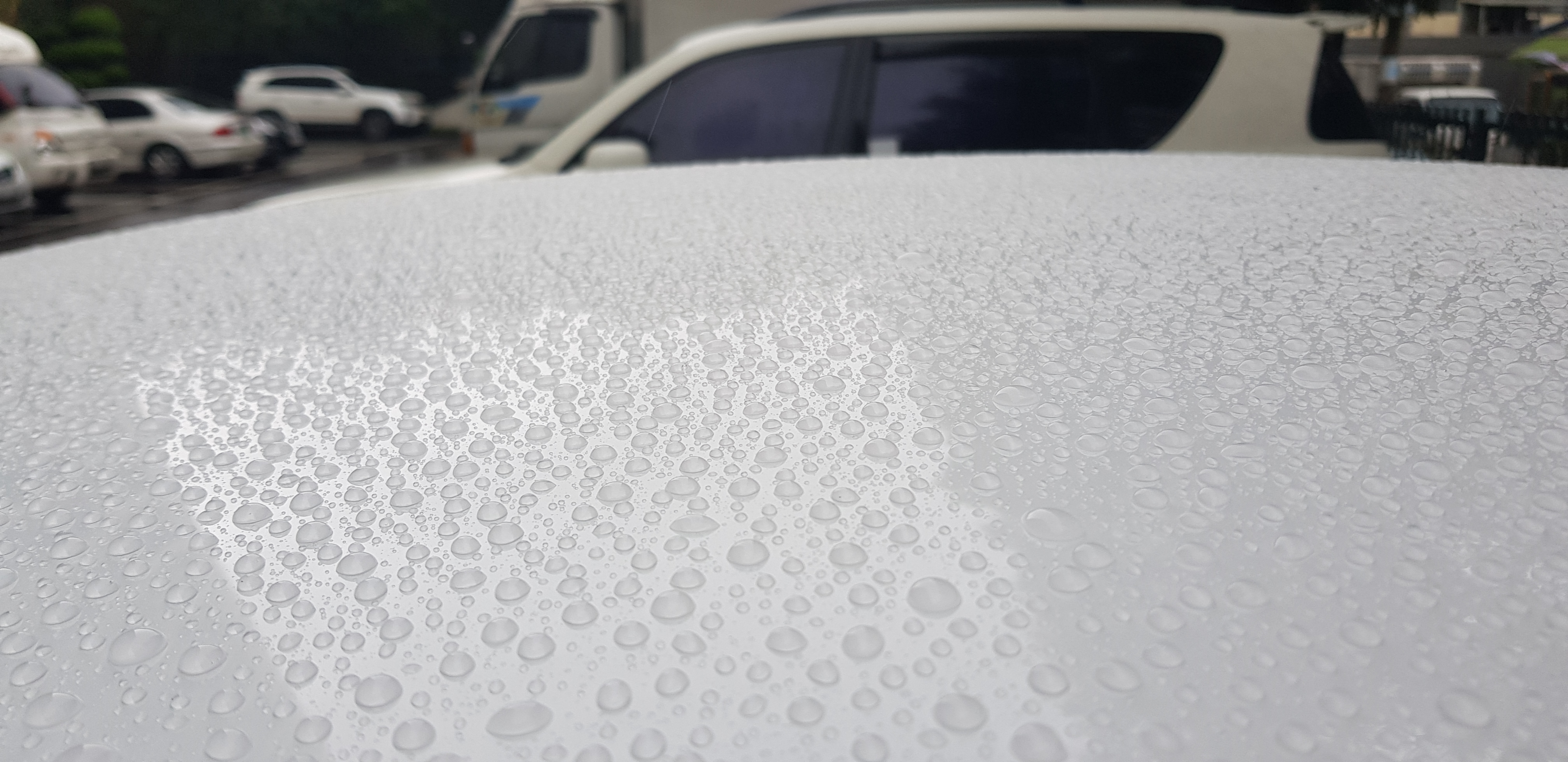 왁스가 올라간 차량도 약 1달정도 지나서 비가오면 발수 효과가 많이 떨어지는 걸 볼 수 있는데 이 테프론 코팅은 보시는 것 처럼 6개월이 지나도 발수 효과가 지속되고 있습니다. 또한 비가 그치고 차 표면의 빗물이 마르게 되면 코팅이 안되어 있는 일반 차 표면의 경우 빗물 얼룩과 흙자국이 남아 더러워지게 되는데 테프론 코팅을 입히게 되면 물 자국이라던지 얼룩들이 거의 남지 않는 것을 확인할 수 있었습니다.