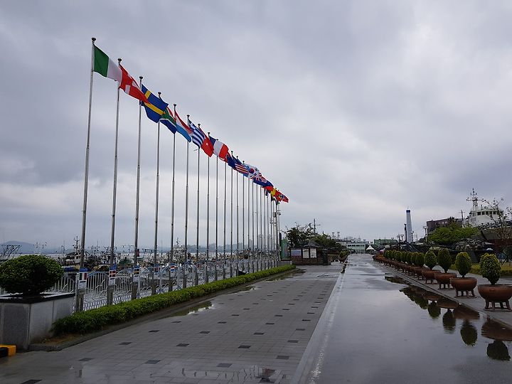 주차후 해안가를 따라 조성되어 있는 진포해양테마공원로 이동해 본다. 야외전시관은 무료개방이고 주 전시관인 위봉함을 관람하기 위해서는 관람료 1000원이 필요하다. 우선 야외에 전시된 만국기가 보인다. 6.25전쟁때 한국을 도와 참전한 국가들의 국기가 펄럭인다.